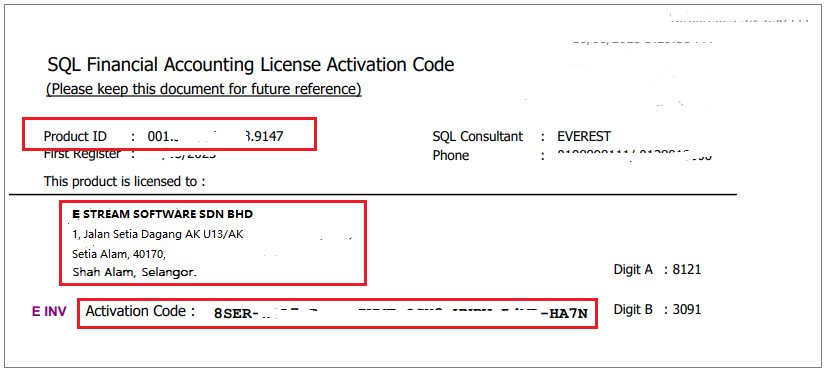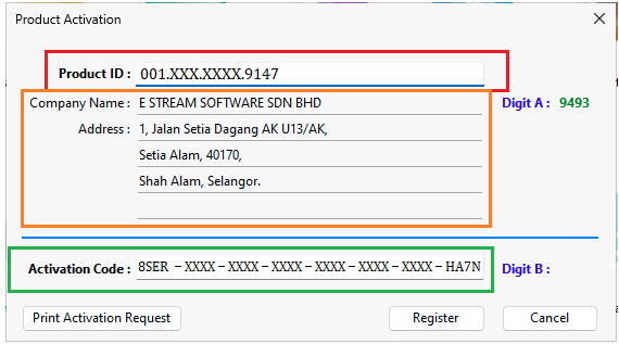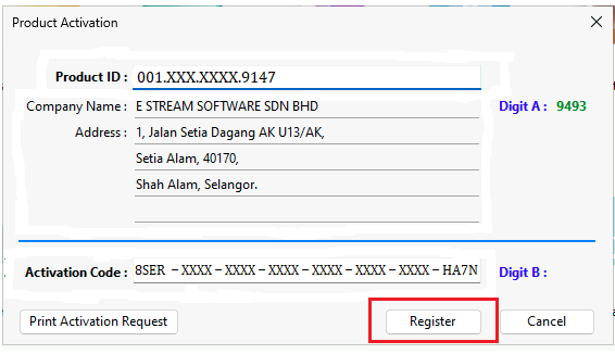 4. Paste your Product ID, Company Name and Address & Activation Code in your system